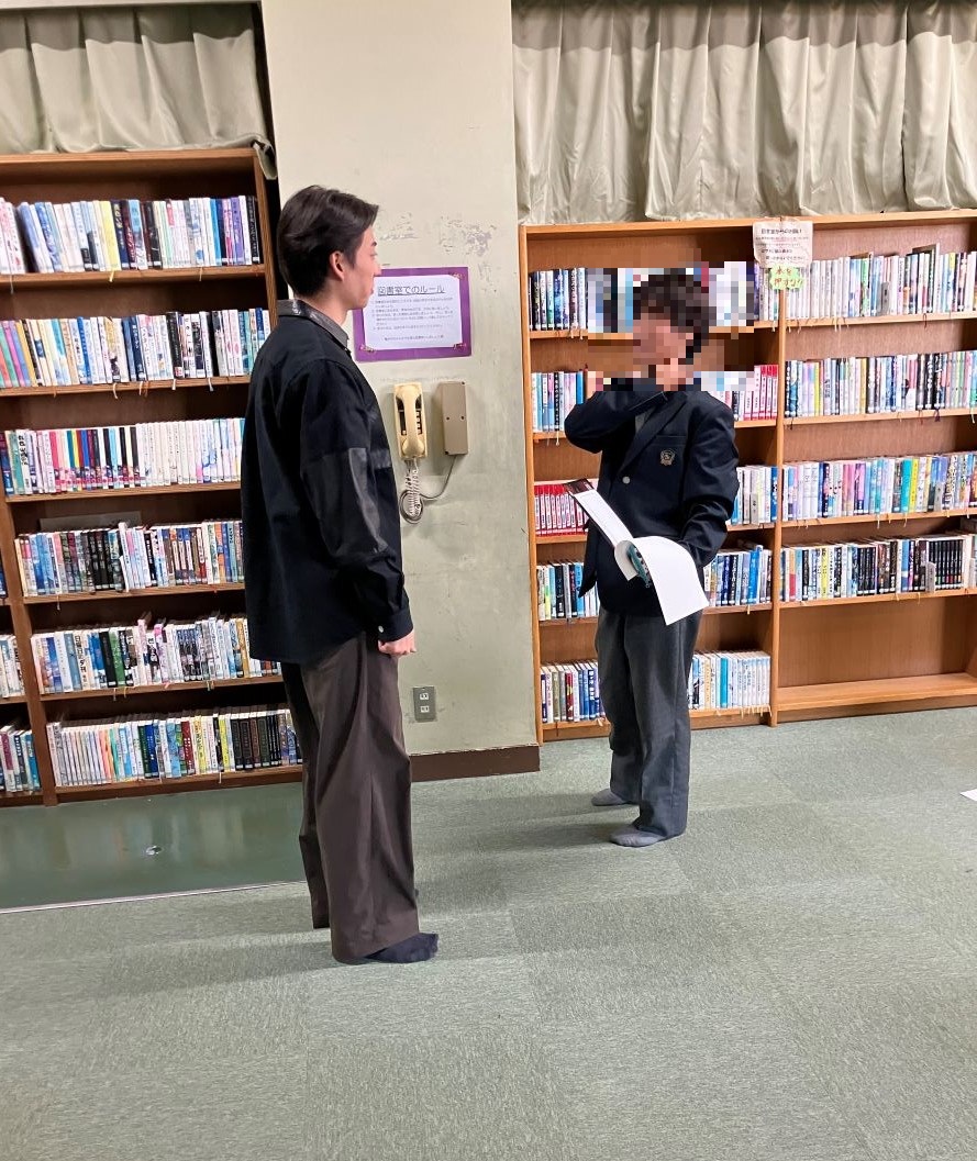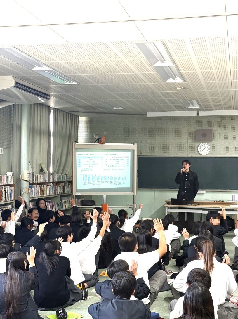 1年生4クラス約140名の生徒たちが2クラスずつ、図書室に集まって授業を受けてくれました。