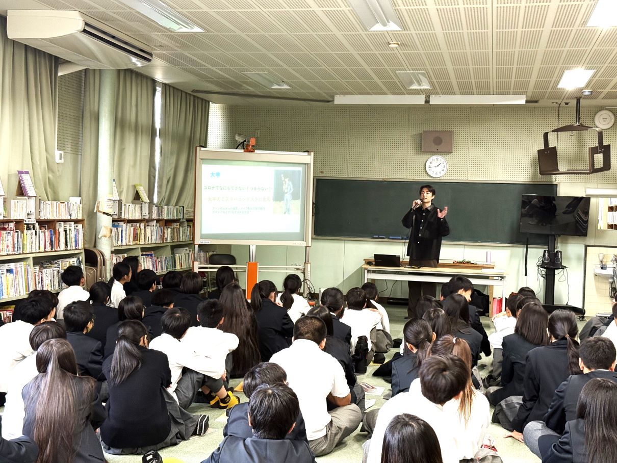 1年生4クラス約140名の生徒たちが2クラスずつ、図書室に集まって授業を受けてくれました。
